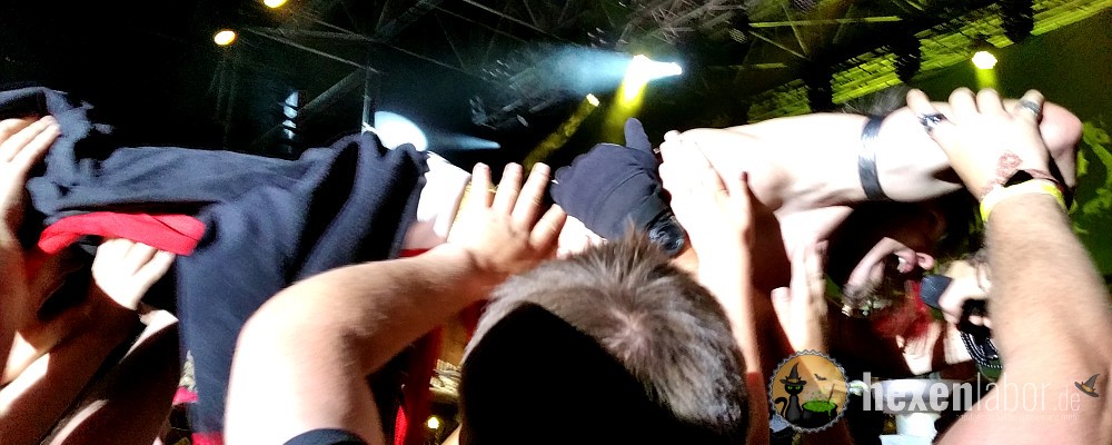 Nervig war mittlerweile das exzessive Croudsurfing, mit dem Alkoholkomsum steigt zwar einerseits die Bereitschaft, andererseits minimierten sich wohl die Möglichkeiten der Körperspannung. Lange Rede, kurzer Sinn, es ist absolut nicht lustig zu versuchen einen nassen Sack nach vorne zu wuchten.