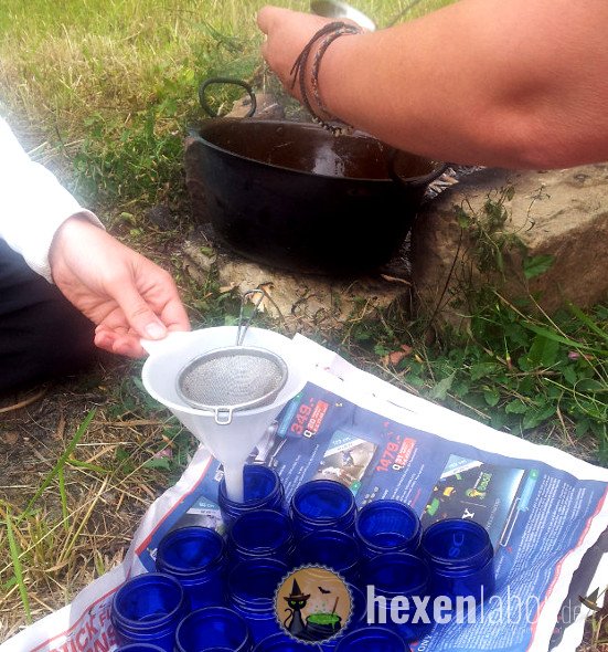 Nachdem wir unsere Schätze nochmals besprochen und sortiert hatten, begannen wir mit der Zubereitung der Gerichte, die wir über dem offenen Feuer ausbacken und kochen wollten. Es gab Hollerküchlein im Backteig, Pfannkuchen mit eingebackenen Kräutern, gefüllt mit Frischkäse und Lachs, garniert mit tief orangen Taglilien. Leckeren und gesunden Kräuterquark mit Brot und Beinwell im Backteig ausgebacken, das alles bereiteten wir gemeinsam zu. Das war ein Fest für alle Sinne, schmeckte und roch nicht nur wunderbar, sondern war auch wunderschön anzusehen! Dazu kam noch das Gefühl des Kochens im Freien, der Geruch von Sommer und abgebranntem Holz, fliegende Asche und Kochgerüche, die hungrig machten. Nach einem ausführlichen und köstlichen Mahl war noch genug Zeit die Standortbedingungen der Kräuter, die man im heimischen Garten anpflanzen könnte, zu erläutern. Welches Kraut braucht welchen Standort und möchte was für Nachbarn haben um gut gedeihen zu können? Nebenbei ließ Ursula die Bienenwachscreme mit reichhaltigen Ölen und frischen Kräutern auf dem Feuer ziehen, die wir später noch in Glasdosen abfüllten und mit nach Hause nahmen. Ganz gemütlich ließen wir diesen ereignisreichen Tag am Feuer ausklingen und machten uns tiefenentspannt auf den Weg nach Hause.