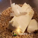 Wenn Du die Füllung verteilt hast kommt noch etwas brauner Zucker oben auf. Ein Teelöffel brauner Zucker reicht für drei Pfirsichhälften aus.