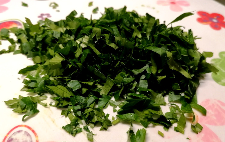 Wasche und hacke dann die Petersilie so grob oder fein, wie Du sie gerne haben möchtest.