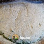 Dann kommt das erste Mal falten dran, wie genau seht ihr auf den Bildern. Nach dem Falten drehst Du Deine recht kompakte Teigplatte um und bestäubst sie großzügig mit Mehl.