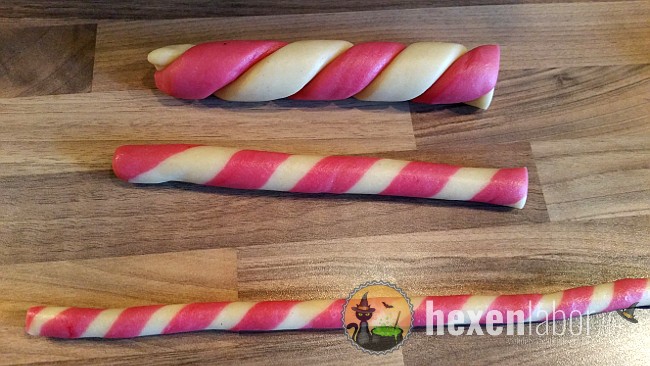 Diese "Taue" schneidest Du dann in Stücke und formst Zuckerstangen daraus. Versuche sie etwa gleichmäßig dick zu formen und lege sie mit wenig Abstand auf ein Backblech. Sobald eines voll belegt ist darf es in den vorgeheizten Backofen, reduziere die Temperatur dabei auf 160°C Ober- und Unterhitze und schiebe das Backblech in die zweite Schiene von unten.