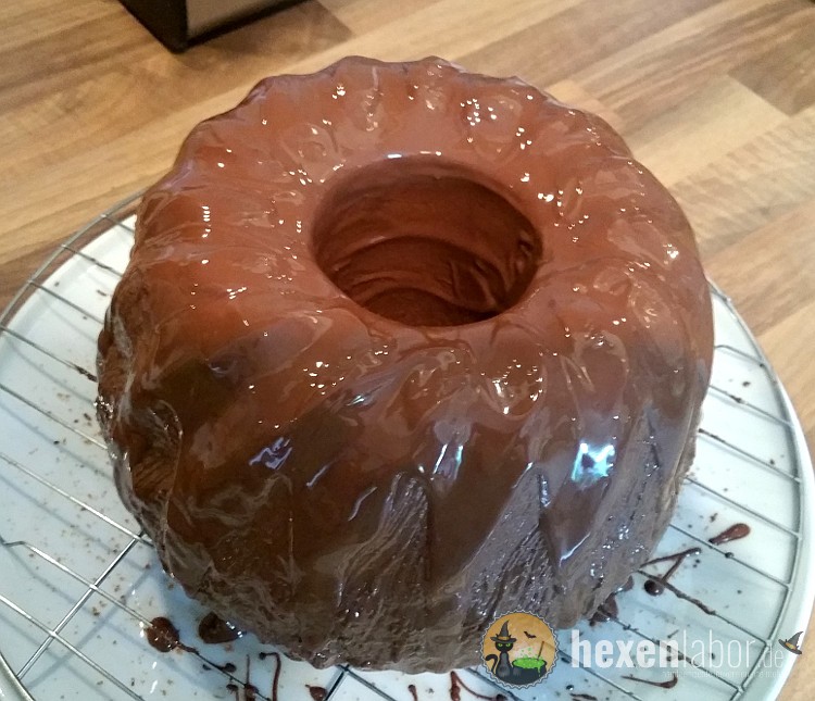 Stürze ihn dann auf einen Backrost und lass ihn komplett auskühlen, bevor Du ihn mit Schokoladenglasur oder Zuckerguss bestreichst oder ihn anschneidest.