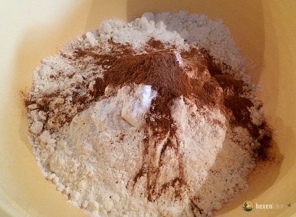 Auch hier sind zuerst die Mehle gefragt, dann das Salz und das Backpulver (bitte unbedingt sieben), dann folgen der Zimt und der Zucker.