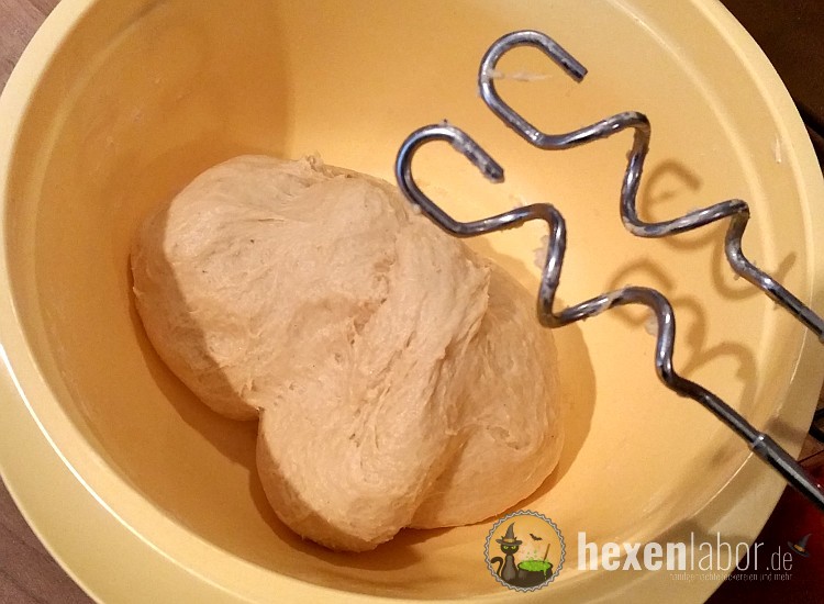 Verrühre die Hefe mit dem Wasser, bis sich die Hefe komplett aufgelöst hat. Gib das Hefewasser dann zu den anderen Zutaten in die Schüssel und verknete alles mit dem Handmixer zu einer Teigkugel.
