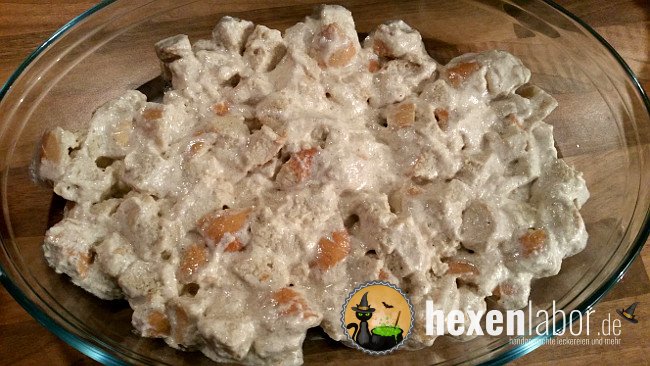 Danach folgen noch die Eigelb und der Schmand, verrühre alle Zutaten gut miteinander. Fülle auf diese Masse die eingeweichten Brötchenwürfel und den Eischnee.