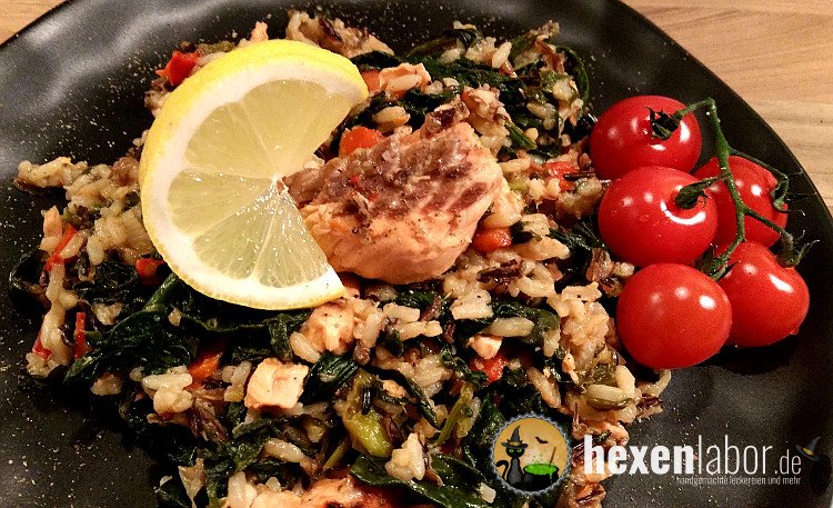 Wildreispfanne mit Lach und Spinat: