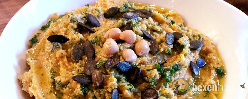 Wie Ihr sehen könnt probiere ich im Moment aus, was man aus einem Kürbis so alles zaubern kann. Da hier im Hexenhaus Hummus sehr beliebt ist, lag es nahe, auch einen Kürbis Hummus zu kreieren. Auf Wunsch wurde er nicht scharf, sondern eher fruchtig pikant gehalten. Farblich steht der Kürbis Hummus dem herrlich bunten Herbstwald in nichts nach! Falls Du Lust bekommen hast, probier ihn doch einfach mal aus! Da er nicht nur vegan, sondern auch noch glutenfrei ist, können auch wirklich alle mit schlemmen!